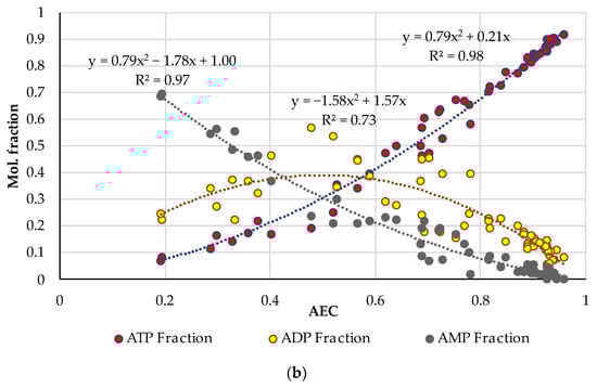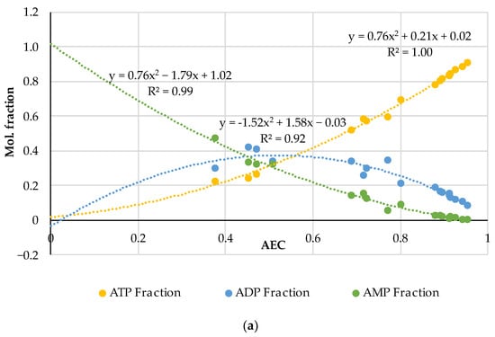 Distribution of adenylates as the mole fractions of ATP, ADP and AMP on the AEC values in 19 samples of very fresh raw pork (a) and 61 samples of fish flesh (b) with the quadratic polynomial approximations of the experimental curves for ATP (the equation on the right), ADP (in the middle) and AMP (on the left). The diagrams were produced purely by the re-analysis of the experimental data from the original papers [,,,,,,,,,,,,,,].