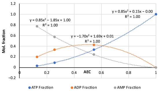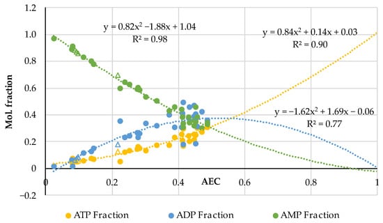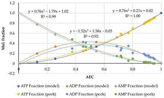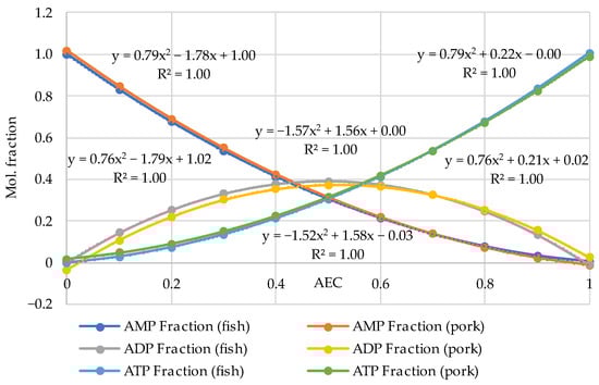 The AEC index can be applied to the experimental data in another way, namely, to graphically represent the distributions of adenylates in accordance with Formula (4) and compare these with the diagrams in the fundamental works [,] that gave rise to the AEC paradigm. For this purpose, the AEC values estimated from the experimental data on adenalyte content in fresh pork and fish presented in a wider set of original works [,,,,,,,,,,,,,,] were plotted along the abscissa axis, and the corresponding values of adenylates relative concentrations expressed in the mole fractions of the total concentration: