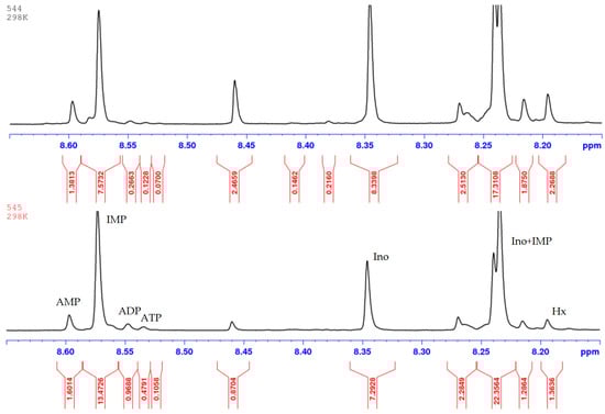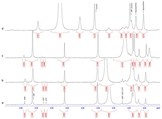 The NMR signals of AMP, ADP, ATP, IMP, hypoxanthine, and inosine were identified through spiking tests, which involved adding solutions of each compound and observing the corresponding increase in the NMR spectra.
