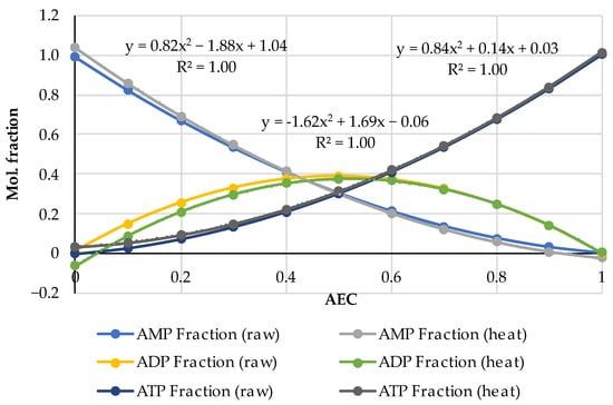 As one can see in Figure 5, the distributions of ATP and AMP for raw and heated meat and fish are in perfect concordance (almost identical) inside each pair. For ADP, there is a minor deviation in the distributions at the lower AEC < 0.5, which resembles the similar effect observable in Figure 2 for raw fish-meat specimens. So, a good complementarity of both distributions, i.e., for the raw samples and for the heated ones, is observed. Such a universal validity in circumstances with avoided enzymatic reactions manifests once again the fundamental rule that the mole fractions of ATP, ADP and AMP are mutually compatible and fixed for any particular value of the AEC.