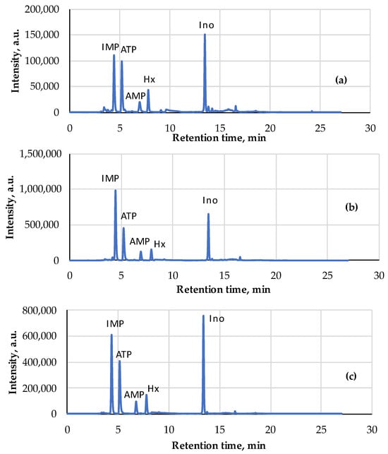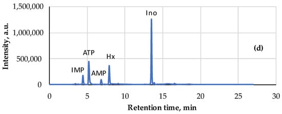 It was reported earlier that an interesting effect opposite to the nucleotide thermal degradation, namely, nucleotide salvage was observed multiple times in fish, pork, and poultry meat after prolonged storage in a refrigerator or bought in a frozen state []. The biochemical nature of this effect is not completely clear yet; it manifested as a substantial increase in ATP, ADP, AMP, and IMP nucleotide content after thermal processing of fish and meat products, which were at the edge of spoilage.