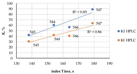 The freshness indices AEC, K and KI of these samples were estimated from the HPLC chromatograms (Table 4, Figure 6) processed according to Section 2.4 and the NMR spectra (Table 4, Figure 7) registered according to Section 2.5 in IBCh RAS. A strong correlation () between the Time index (FPMLC) and K and KI freshness indices (HPLC, NMR) was observed (Figure 8 and Figure 9).