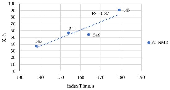 The comparison of the index Time measured by the FPMLC method, and the KI index measured by the NMR spectroscopy for four samples of canned fish (the sample codes are indicated next to each point).