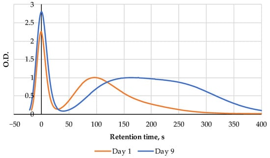 The FPMLC chromatograms of the raw fish samples show a gradual increase in the Time index in the course of the cold storage. On days 8 and 9 of the experiment, a bifurcation of the peak associated with the ATP metabolites became noticeable, which could be associated with the increasing hypoxanthine concentration at the early stages of bacterial spoilage (Figure 10). Starting from day 10, the bifurcated peak gradually shifted to the right. On the 15th day of measurements, when the fish was completely spoiled, the index Time reached a value of 261 s, which is close to the index Time for pure hypoxanthine.