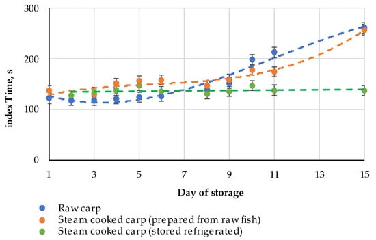 The high concordance between the FPMLC and HPLC data makes the index Time a good candidate as a viable indicator of the freshness state of raw fish before canning, which could be rapidly assessed by the FPMLC technique using the simple and affordable chemical sensor []. It was mentioned earlier that the dietary nucleotides are prone to thermal degradation in the process of high-temperature sterilization treatment before canning and this effect must be taken into account to ensure a correct interpretation of the nucleotide-based freshness indices including the Time index in case of ready-to-eat and canned food. A model experiment with a freshly caught carp fish was conducted to reveal how high-temperature sterilization changes the Time index at different stages of cold storage.