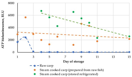 The dynamics of the ATP content in raw and steamed fish samples were measured by the bioluminescence technique presented in Figure 12. Despite high fluctuations, which are typical for this technique, the general trends are quite evident. ATP in the raw fish decreased to a near-zero level after 45 h of storage; quite unexpectedly, a high level of free ATP was observed even after 24 h after catching. After heat treatment the free ATP content was higher than in the raw samples even in the first days of storage; moreover, it decreased very slowly up to the 15th day of the experiment. In the cold-stored sample prepared on day 2, the content of ATP decreased very slowly compared to the raw samples.
