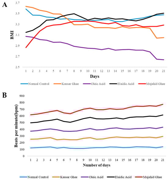 Figure 2 illustrates the changing trends in the body and mass index (BMI) of the rabbits in conjunction with oleic acid, elaidic acid, Mujahid Ghee, and Kausar Ghee. The BMI progressively increased during the feeding of elaidic acid and Mujahid Ghee, indicating that the rabbits were unhealthy. In the control group, a constant trend was observed, and the BMI of the oleic acid-fed rabbits gradually decreased, indicating that the animals were healthier. Nevertheless, if we examine the Kausar Ghee, we see a variation in its trend. The one-way ANOVA followed by Dunnett’s multiple comparisons test revealed significant differences between the normal control group and all treatment groups. Oleic acid and Mujahid Ghee had significant effects (p < 0.001), followed by Kausar Ghee (p = 0.001), while elaidic acid had a significant but relatively smaller effect (p < 0.046). These findings highlight the potential differential impacts of these substances on the measured outcome and suggest further investigation into the specific mechanisms underlying these effects. The heart rates of the rabbits were examined for 21 days and showed a gradual increasing trend group-wise. The normal control group’s heart rate was calculated as between 120 and 140 beats per minute. In elaidic acid, the heart rate varies from 120 to 180 beats per minute. In the oleic acid group, heart rate was increased from 120 bpm to 140 bpm. In Mujahid Ghee and Kausar Ghee, it varied between 120 bpm to 160 bpm and 130 bpm to 150 bpm, respectively. Therefore, it is noticeable from this research that the high intake of trans fatty acids in the daily routine may be associated with increased heart rates in rabbits of the elaidic acid group and Mujahid Ghee group. Although a rise in heart rate indicates heightened stress levels, it is important to acknowledge that heart rate alone cannot be used to assess stress and anxiety definitively. Further research needs to incorporate other indicators, such as cortisol levels, behavioral observations, and other physiological markers, to offer a more comprehensive assessment of stress and anxiety. It has been reported that an increase in TFA in the diet, without increasing total caloric intake, can cause increased weight and abdominal fat deposition [36].