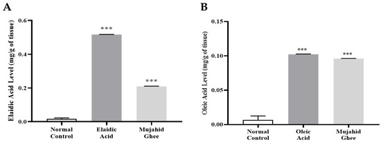The quantitative evaluation of elaidic acid in serum was performed using reversed-phase HPLC, the isocratic elution mode, and a diode array detector. All the HPLC graphs are presented in Figure S2. According to the analysis, the retention times for elaidic acid, Mujahid Ghee, and oleic acid were 3.998 min, 4.085 min, and 2.534 min, respectively. These values suggest that the retention time is dependent on the degree of unsaturation. Elaidic acid and Mujahid Ghee are more unsaturated than oleic acid, so they took more time to elute. Furthermore, the results of HPLC analysis of the elaidic acid calibration curve showed that the concentration of the elaidic acid was 0.51 mg/g, which is much higher than the values of 0.23 mg/g of oleic acid and 0.20 mg/g Mujahid Ghee (Figure 4). Similarly, the results of the HPLC analysis of the oleic acid calibration curve showed that the concentration of elaidic acid was 0.16 mg/g, which is also higher than that of 0.10 mg/g of oleic acid and 0.09 mg/g of Mujahid Ghee. Investigations have revealed a straightforward relationship between serum TFAs and the utilization of TFAs. The serum TFA level may reflect the body’s unsaturated fat synthesis, edible fat nature, and fat utilized during significant stretching [53]. Various adverse impacts of trans unsaturated fats collectively, as well as those created by incomplete hydrogenation on CVD, blood lipids, irritation, oxidative pressure, endothelial wellbeing, body weight, insulin affectability, and malignant growth specifically, have been previously confirmed [54]. Various studies have also confirmed that elaidic acid is the key fraction of trans fatty acids taken into the body through the consumption of PHVOs [55].
