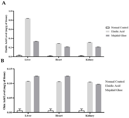 The quantitative evaluation of elaidic acid in the liver, kidney, and heart was carried out using reversed-phase HPLC, and all the HPLC graphs are presented in Figures S3, S4 and S5, respectively. The results of the HPLC analysis of the elaidic acid calibration curve showed that the level of elaidic acid in the liver was higher in the liver as compared to the heart and kidney at 0.83 mg/g, which is greater than 0.25 mg/g of oleic acid and 0.33 mg/g of Mujahid Ghee in liver tissues, as shown in Figure 5. The second highest value of elaidic acid was recorded in the kidney, which was 0.31 mg/g, higher than 0.24 mg/g of Oleic Acid and 0.21 mg/g of Mujahid Ghee. The heart had the lowest concentration, but the significant value of elaidic acid was 0.28 mg/g, which was slightly higher compared to 0.25 mg/g of oleic acid and 0.21 mg/g of Mujahid Ghee. Similarly, the results of HPLC analysis of the oleic acid calibration curve showed that the concentration of elaidic acid in the liver was 0.24 mg/g, which is greater than that of 0.10 mg/g of oleic acid and 0.12 mg/g of Mujahid Ghee, as shown in Figure 5. In the case of the heart, the concentration of elaidic acid was 0.11 mg/g, which is slightly greater than the 0.10 mg/g of oleic acid and 0.09 mg/g of Mujahid Ghee. In contrast, in the kidney, the concentration of elaidic acid was 0.11 mg/g, which is greater than the 0.10 mg/g of oleic acid and 0.09 mg/g of Mujahid Ghee. Several studies have focused on the impact of food sources rich in trans fatty acids on hepatic capacity and oxidative pressure. Oxidative stress is currently recognized to be a significant part of the progression of MAFLD [15]. It is reported that hepatic unsaturated fat might affect the level of liver injury [57]. Dietary fatty acids, mainly unsaturated fatty acids, greatly influence the phospholipid content and fatty acid composition of cellular membranes. Moreover, in another study, trans-octadecenoic isomers were detected in various biopsy specimens collected during open-heart surgery [58]. CKD is a complicated, developing chronic kidney state that can be explained as the irregularity of the kidney structure and is a serious health condition [59].
