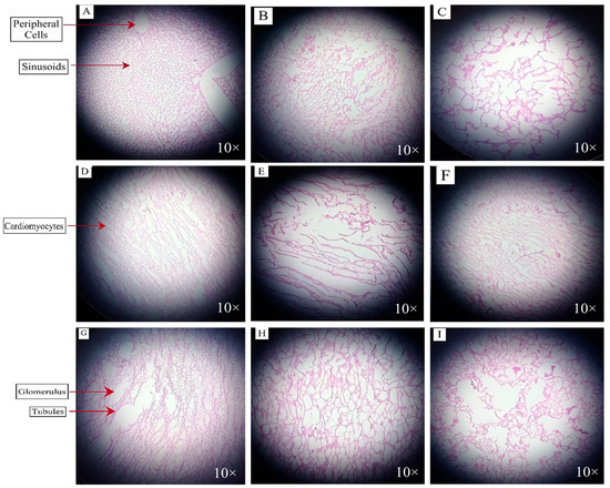 The blood was carefully collected from rabbits using a previously described method [28]. Briefly, a 26-gauge syringe was used to collect blood from the central ear artery of the rabbits after cleaning with 95% v/v alcohol and o-xylene. For dissection, a bunny burrito was made by wrapping the rabbit in a towel to facilitate an intramuscular injection of alfaxalone that can startle the rabbit. Using 3 mL syringes, about ≤1 mL alfaxalone was administered intramuscularly to the caudal epaxial muscle. After the administration of anesthesia, the rabbits were allowed to rest in a quiet cage for 5–10 min to enable sedation to occur. After that, a previously reported method was used to perform the dissection [29]. The rabbit hearts, kidneys, and livers were collected and separated for further analysis. A small portion of each organ was cut and placed in a formalin vial for tissue histopathology. In contrast, a small portion of the tissue was stored in normal saline for antioxidant quantification. Hematoxylin and eosin (H&E) were used for staining, and the slides of the tissue samples were examined at a magnification of 10× and a resolution of 200 nm.