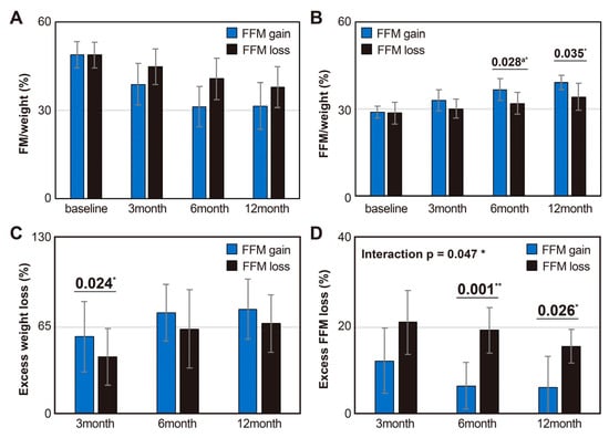3.3. Body Composition and Weight Changes Up to 1 Year After Surgery between Groups Based on the Relative FFM Changes to Weight Loss