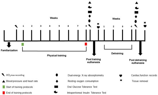Here, we hypothesize that a short period of detraining (half the time of training) is sufficient to abolish the superior adaptive responses of the accumulated HIIT in rats. Therefore, this study was designed to investigate the effects of a detraining period of four weeks following eight weeks of a traditional versus an accumulated HIIT protocol on the adiposity, glucose tolerance, insulin sensitivity, cardiac function and hypertrophy, and skeletal mitochondrial density of Wistar rats.