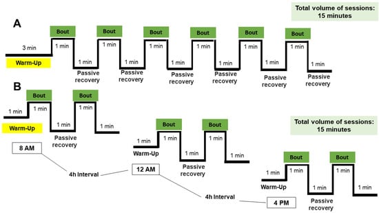 Exercise training protocols. 1xHIIT: High-Intensity Interval Training performed with single daily sessions (A); 3xHIIT: High-Intensity Interval Training performed with three shorter daily sessions (B).