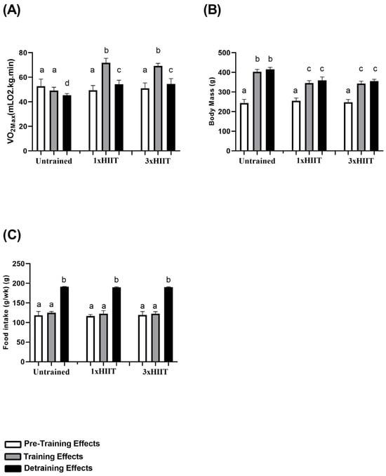 Training and detraining effects of single versus three shorter daily sessions of HIIT on (A) VO2max, (B) body mass, and (C) food intake. Data are presented as mean ± S.D. n = 24/group. Two-way ANOVA followed by Tukey test. Untrained, non-exercised group; 1xHIIT, High-Intensity Interval Training performed in single daily sessions; 3xHIIT, High-Intensity Interval Training performed in three shorter daily sessions. Different letters indicate statistical differences.