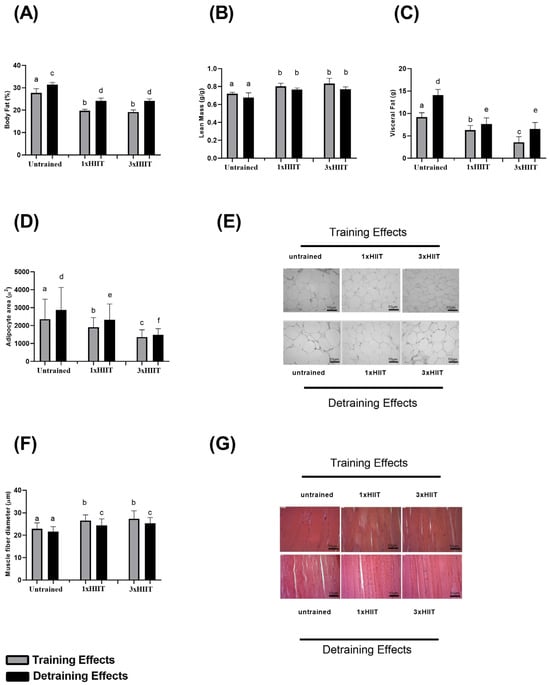 Figure 4 presents the data on body fat mass (A), lean mass (B), visceral fat mass (C), adipocyte size (D–E), and muscle fiber diameter (F–G) during the training and detraining periods. After training, the HIIT groups exhibited lower body fat mass than the untrained rats (1xHIIT vs. Untrained: p < 0.0001; 3xHIIT vs. Untrained: p < 0.0001). No differences in body fat mass were found between the 1x and 3xHIIT groups (1xHIIT vs. 3xHIIT: p > 0.05). After four weeks of detraining, body fat mass increased in all groups. However, it remained lower in the HIIT groups compared to the untrained rats (1xHIIT vs. Untrained: p < 0.0001; 3xHIIT vs. Untrained: p < 0.0001). Body fat mass did not differ between the 1x and 3xHIIT rats after detraining (p > 0.05).
