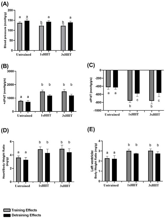 Training and detraining effects of single versus three shorter daily sessions of HIIT on cardiovascular parameters. (A) Blood pressure; (B) +dP/Dt; (C) -dP/Dt; (D) heart/body weight ratio; (E) left ventricle/body weight ratio. Data are presented as mean ± S.D. n = 24/group. Two-way ANOVA followed by Tukey test. Untrained, non-exercised Group; 1xHIIT, High-Intensity Interval Training performed in single daily sessions; 3xHIIT, High-Intensity Interval Training performed in three shorter daily sessions. Different letters indicate statistical differences.