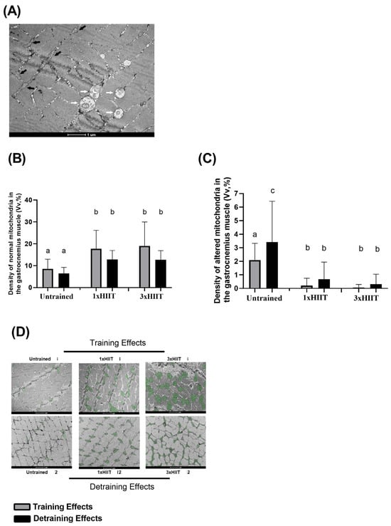 Training and detraining effects of single versus three shorter daily sessions of HIIT on mitochondria density. Representative mitochondria of the gastrocnemius muscle for Untrained, 1xHIIT, and 3xHIIT groups (A). White arrows show normal mitochondria, and black arrows show altered mitochondria. Quantification of normal (B) and altered (C) mitochondria density in gastrocnemius muscle fibers. Transmission electron micrographs of transverse sections of the gastrocnemius muscle (D). Data are presented as mean ± S.D. Two-way ANOVA followed by Tukey test. Untrained, non-exercised group; 1xHIIT, High-Intensity Interval Training performed in single daily sessions; 3xHIIT, High-Intensity Interval Training performed in three shorter daily sessions. Different letters indicate statistical differences.