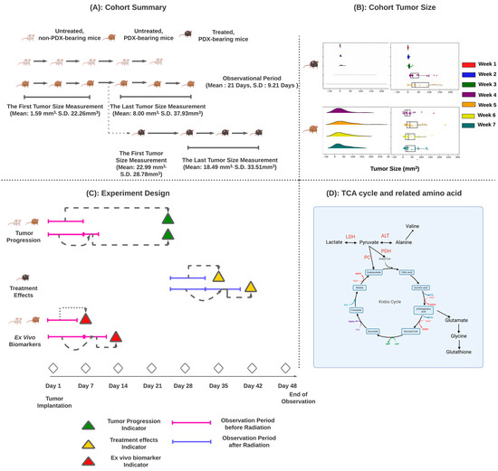 Overview of Cohorts and Tasks. (A) summarizes our cohort, tumor size, and tasks. The treated PDX-bearing mice are a subset of the untreated PDX-bearing mice. The first treated mouse was introduced on Day 21 after tumor implantation. (B) displays the tumor sizes for both untreated and treated PDX-bearing mice over several weeks as a rainfall plot. (C) lists the design of each experiment. We used tumor information from Day 1 to Day 14 to predict tumor progression after Day 21. This prediction involved identifying tumor progression using conventional MRI, HPMRS, and NMR biomarkers from untreated non-PDX-bearing mice and untreated PDX-bearing mice. The treatment effect prediction focused solely on treated PDX-bearing mice. We used conventional MRI, HPMRS, and NMR biomarkers after radiology to predict the outcome (tumor regression or progression) on the end date (Day 48). For predicting ex vivo biomarkers, we used conventional MRI and HPMRS to predict the status of ex vivo biomarkers (normal/abnormal). The tumor information was gathered before implementing the ex vivo biomarker measurement. (D) provides biological details of the TCA cycle and amino acid metabolism to understand the relationship between the in vivo biomarker (HPMRS) and ex vivo biomarker (NMR).