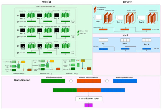 As shown in Figure 2, our model is composed of four parts to handle different modalities. The first part, the MRIs processing unit, includes the MRIs encoder and the time-elapsed attention unit. The HPMRS images are processed by a unique module called the HPMRS processing unit, which consists of the HPMRS encoder and a recurrent neuron network (RNN). The remaining NMR information is processed using another RNN. The final part of the model, the classifier, combines all the representations from each unit to make its prediction. We provide more details about the model in Table 2.