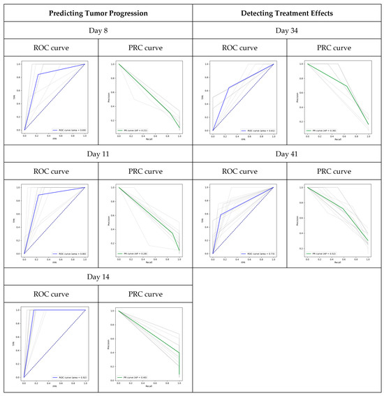 The model’s performance in predicting treatment effects is outlined in Table 4. Seven days post-treatment, the area under the curve (AUC) registered at 0.608, increasing to 0.728 by day fourteen, as indicated by cross-validation. However, there was a decrease in AUC variation over time. The true positive rate (TPR) increased from 0.369 to 0.585 between the seventh and fourteenth day, while the false positive rate (FPR) decreased from 0.151 to 0.129 over the same period. All benchmark variations also showed a decrease over time. These trends indicate that adding temporal information could slightly improve the model’s performance. The ROC and PRC curves are displayed in Figure 3. We also observed that adding temporal information can reduce the variation in detecting treatment effects. However, the variation remains larger than predicting tumor progression.