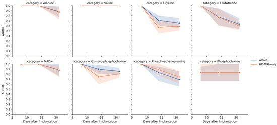 The model predicts whether a given biomarker is normal or abnormal on Days 8, 14, and 21. We compared the model’s predictions with the actual results using AUC. The model was generally more accurate in predicting the status of amino acid metabolism biomarkers compared to reactive oxygen metabolism biomarkers or cell membrane metabolism biomarkers (Figure 4). To determine the contribution of HPMRS to the prediction of ex vivo biomarkers, we excluded anatomical MRI data and used only HPMRS information. The accuracy of most biomarkers remained similar when using this complete information. However, two ex vivo biomarkers, glycine and glycero-phosphocholine, dropped by more than 10%. This suggests that the model’s prediction of amino acid metabolism is more reliable than its prediction of the other two categories. We also presented the AUROC and AUPRC of each biomarker across different time points in Supplementary Table S1.