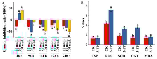 Effects of 3-fluorophenol on the growth and biochemical indicators of Chlorella pyrenoidosa. (A) Time–dose effect of 3-fluorophenol exposure on C. pyrenoidosa growth. (B) The biochemical indicators of C. pyrenoidosa treated by 100 mg/L 3-fluorophenol for 96 h. Note: a, b, and c indicate significant differences detected at p < 0.05. The values of TSP, ROS, SOD, CAT, and MDA refer to their levels in control (CK) or 3-fluorophenol (3-FP) samples, measured in mg/mL, ×10−3 u/s/μg prot, U/mg·prot, U/mg·prot, and nmol/mg·prot, respectively.