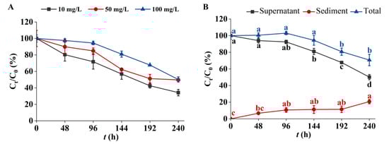 In the absence of algal cells, 3-fluorophenol could exist stably in the culture system (Supplementary Materials Figure S1). Figure 3A shows the removal efficiency of 3-fluorophenol by C. pyrenoidosa. The residual 3-fluorophenol in the algal solution decreased gradually over time. After 240 h of treatment, the residual ratios (Ct/C0) of 3-fluorophenol at initial concentrations of 10, 50, and 100 mg/L were 34.26 ± 3.93%, 49.18 ± 0.64%, and 49.72 ± 3.18%, respectively. These results indicate that the removal efficiency of C. pyrenoidosa for 3-fluorophenol is strongly dependent on the initial concentration, with lower concentrations showing better reduction efficiency. This finding is consistent with Sharma et al. [], who observed a similar decrease in the removal rate of sodium diclofenac by C. sorokiniana with increasing concentration.