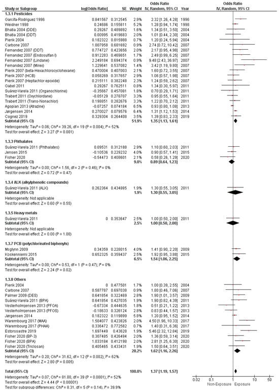 | Suarez-Varela [66] | 2011 | Cohort | Spain | 262 | 1002 | NA | Survey-based | NA | NA | NA | EDC | “The study provides some but limited evidence that occupational exposure to possible endocrine disrupting chemicals during pregnancy increases the risk of hypospadias.” |
