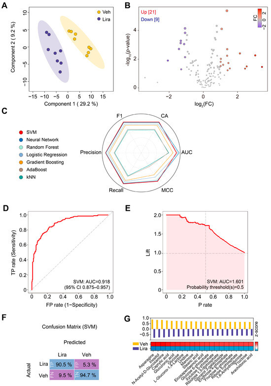 Changes in plasma metabolites in DIO mice in response to liraglutide. (A) Partial least squares discriminant analysis (PLS-DA) plot. (B) Volcano plot. FC, fold change. (C) Radar chart comparing the performance of seven machine learning models. CA, classification accuracy. AUC, area under the receiver operating characteristic (ROC) curve. MCC, Matthews correlation coefficient. F1, 2 × (Precision × Recall/Precision + Recall). (D) ROC curve of the SVM model. TP rate, true positive rate; FP rate, false positive rate. The calculation of the 95% confidence interval (CI) was based on the mean and covariance of 100 random sampling tests. (E) Performance lift curve of the SVM model. Lift, predicted positive event rate; P rate, precision rate. (F) Confusion matrix for the SVM model. TN, true negative; FN, false negative. Veh, vehicle; Lira, liraglutide treatment. (G) Top-ranked metabolic shifts. The bar graph and the heatmap were generated using the z-score of normalized peak intensity.