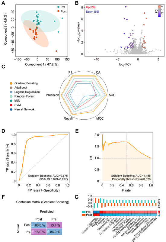 Changes in plasma metabolites in patients with T2DM in response to liraglutide. (A) PLS-DA plot. (B) Volcano plot. FC, fold change. (C) Radar chart comparing the performance of seven machine learning models. (D) ROC curve of the Gradient Boosting (XgBoost) model. The calculation of the 95% confidence interval (CI) was based on the mean and covariance of 100 random sampling tests. (E) Performance lift curve of the Gradient Boosting model. Lift, predicted positive event rate; P rate, precision rate. (F) Confusion matrix for the Gradient Boosting model. Pre, pre-liraglutide treatment; Post, post-liraglutide (Post) treatment. (G) Top-ranked metabolic shifts. The bar graph and the heatmap were generated using the z-score of normalized peak intensity.