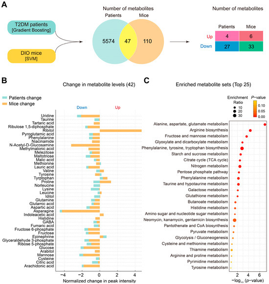 Comparison of plasma metabolomic changes between DIO mice and patients with T2DM. (A) A Venn diagram showing the overlapping and unique metabolites identified in patients with T2DM and DIO mice after processing with Gradient Boosting and SVM, respectively. (B) Changes in metabolite levels. In the bidirectional bar graph, the left side represents decreased, and the right side represents increased. The length of the bars indicates the extent of the increase or decrease. (C) Top-ranked metabolite set enrichment analysis. Circle size indicates the expected enrichment value for a metabolic pathway.
