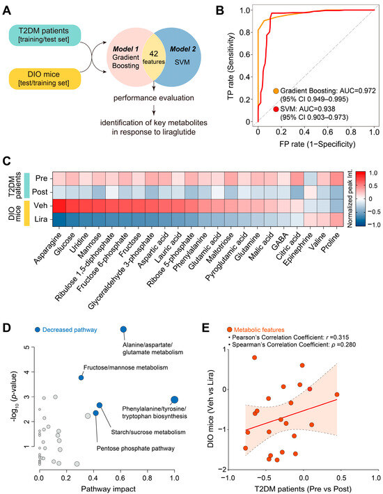 Cross-evaluation and correlation analyses between DIO mice and patients with T2DM. (A) Study design for cross-evaluation. (B) ROC curves of the Gradient Boosting and SVM models. The calculation of the 95% confidence interval (CI) was based on the mean and covariance of 100 random sampling tests. (C) Heatmap of metabolites significantly altered by liraglutide that were common to DIO mice and patients with T2DM. Color gradient represents normalized peak intensity. (D) Topological analysis of metabolic pathways. Blue dots represent pathways decreased by liraglutide. (E) Correlation plot of metabolic responses to liraglutide in DIO mice and patients with T2DM. The X- and Y-axes represent metabolic changes induced by liraglutide from patients with T2DM and DIO mice, respectively. The reddish-orange dots indicate individual metabolic features. The red line shows R-squared (R2), and its value is 0.064 (95% CI: −0.189–0.609). Pearson’s (r) and Spearman’s (ρ) correlation coefficients are shown above the graph. The criteria for Pearson’s correlation coefficients were as follows: <0.1, no correlation; 0.1 to <0.3, weak correlation; 0.3 to <0.5, moderate correlation; 0.5 to <0.7, strong correlation; 0.7 to 1.00 very strong correlation. The criteria for Spearman’s correlation coefficients were as follows: <0.1, no correlation; 0.1 to <0.4, weak correlation; 0.4 to <0.8, moderate correlation; 0.8 to 1.0, strong correlation.