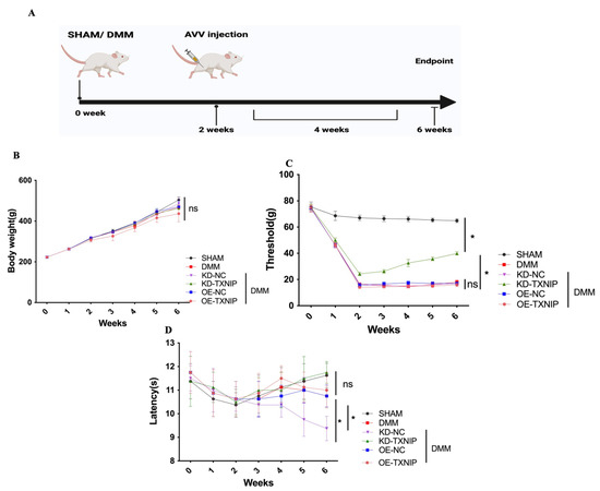 Regarding body weight, there was no notable difference among the different groups (Figure 1B). Furthermore, after DMM surgery, the rats received KD-TXNIP treatment, which could effectively relieve mechanical pain symptoms (Figure 1C), and the thermal-pain assessment results did not demonstrate significant differences (Figure 1D).
