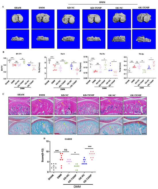 To assess the effect of TXNIP on subchondral bone in the DMM group, CT-3D was conducted to examine alterations in the trabecular bone of the tibia (Figure 2A). OE-TXNIP showed increased cartilage and bone damage compared with the DMM surgery group. Conversely, KD-TXNIP mitigated cartilage degeneration, while the OE-TXNIP resulted in increased subchondral bone loss and accelerated degenerative alterations in microstructures after traumatic injury in the subchondral bone of the tibia, in contrast to the KD-TXNIP group. These observations were supported by the increased values of BV/TV, Tb.Th, and Tb.N and decreased values of Tb.Sp, as shown in (Figure 2B). Moreover, this trend matched the histological staining results (Figure 2C,D). In the DMM group, TXNIP-OE caused severe cartilage damage, chondrocyte disorder, and cartilage component loss rather than cartilage protection, which was demonstrated with KD-TXNIP.
