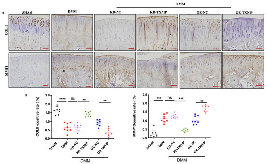 IHC images of rats. (A) Col II and MMP13 IHC images of rats after SHAM/DMM surgery and KD-NC, KD-TXNIP, OE-NC, and OE-TXNIP intra-articular injection of articular cartilage; (B) IHC quantification, (red scalebar = 200 μm), ns: non-significant, ** p < 0.01, *** p < 0.001, **** p < 0.0001, N = 8.