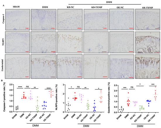 IHC images of rats. (A) Caspase-1, NLRP3, and gasdermin D IHC images of rats after SHAM/DMM surgery and KD-NC, KD-TXNIP, OE-NC, and OE-TXNIP intra-articular injection of articular cartilage; (B) IHC quantification (red scalebar = 200 μm), ns: non-significant, * p < 0.05, ** p < 0.01, *** p < 0.001, **** p < 0.0001, N = 8.