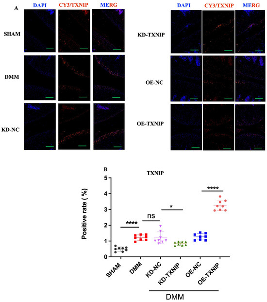 Immunofluorescence staining images of rats. (A) TXNIP IF images of rats after SHAM/DMM surgery and KD-NC, KD-TXNIP, OE-NC, and OE-TXNIP intra-articular injection of articular cartilage; (B) IF quantification (green scalebar = 200 μm), ns: non-significant, * p < 0.05, **** p < 0.0001, N = 8.