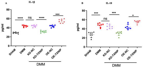 After DMM surgery, the levels of serum inflammatory cytokines IL-1B and IL-18 were elevated and further increased after OE-TXNIP injection. In comparison, the KD-TXNIP intra-articular injection decreased the production of inflammatory factors (Figure 6A,B).