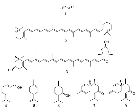 The largest family of natural products are the terpenes (Figure 1), whose biosynthesis occurs in the mevalonic acid pathway and in the methylerythritol phosphate pathway [2]. They are composed of isoprenoids, which are isoprene units with five carbon atoms (1). The number of isoprene units in their structure is what allows them to be classified as monoterpenes (C10), sesquiterpenes (C15), diterpenes (C20), triterpenes (C30), etc. These metabolites participate in various functions such as growth regulation, the formation of photosynthetic pigments such as phytol, carotenoids such as lycopene (2) or capsanthin (3), as well as being part of the structure of compounds such as phytosterols. The attraction they exert on some pollinators and seed dispersers is considered another of their functions. The volatile compounds responsible for the aroma of flowers and plants are complex mixtures, mainly of mono and sesquiterpenes, which result in essential oils, such as geraniol (4), (+)-limonene (5), (−)-menthol (6), α-turmerone (7), and β-turmerone (8). They can also contribute to water retention and antibacterial activity in plants [61,62].