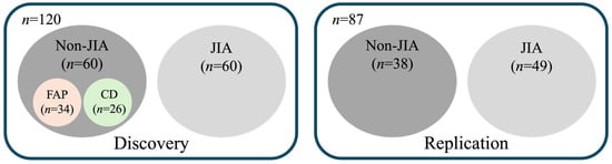 - Prahalad, S.; Glass, D.N. A comprehensive review of the genetics of juvenile idiopathic arthritis. Pediatr. Rheumatol. 2008, 6, 11, Bookshelf ID: NBK554605. [Google Scholar] [CrossRef] [PubMed]