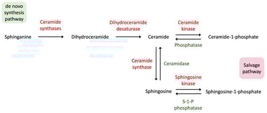 - Quinville, B.M.; Deschenes, N.M.; Ryckman, A.E.; Walia, J.S. A comprehensive review: Sphingolipid metabolism and implications of disruption in sphingolipid homeostasis. Int. J. Mol. Sci. 2021, 22, 5793. [Google Scholar] [CrossRef]