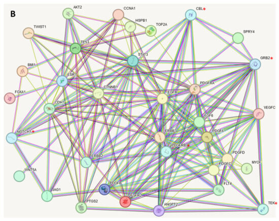 Using enrichment analysis, an additional five proteins were elucidated by STRINGdb—CBL, GRB2, NOTCH1, PDGFRB, and TEK (Figure 2B). The network presented in Figure 2A shows high-evidence associations of the proteins coded by selected genes. The additional proteins are also highly associated with the presented network (Figure 2B). The average connection association with added proteins increased from = 7.40 to κ = 10.46. Such an increase demonstrates that the added genes play a significant role in the organization of a strongly connected protein network involved in cancer development. This fact points to mentioned proteins as preferable targets for drug design.