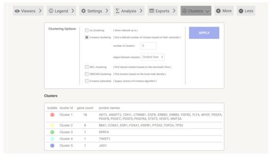 Using STRINGdb, we performed k-means clustering on the genes from Table 2 in order to create five separate clusters with genes that are interacting with one another. K-means clustering utilizes a machine-learning model to divide a dataset into several such unique clusters. The clusters are shown in Figure 3. Submitting the genes from each cluster to DAVID (Database for Annotation, Visualization and Integrated Discovery), version 6.8 [15] we were able to identify the top pathways for each cluster. We found that the UniProt signaling pathway had the greatest number of genes from the first cluster, playing an important role in the pathway. This signaling pathway allows for the ribosome to effectively create proteins. The most prominent pathway in the second cluster was the UniProt nucleus pathway, which works within the nucleus and specifically with the pore complex. In the third cluster, the SPRY4 gene encodes a protein known as sprouty RTK signaling antagonist 4. This protein is part of the sprouty family, which acts as inhibitors of receptor tyrosine kinase (RTK) signaling pathways. These pathways are crucial for cell growth, differentiation, and survival. In the fourth cluster, the TWIST1 gene encodes the TWIST1 protein, which is a basic helix-loop-helix (bHLH) transcription factor. This protein plays a crucial role in various biological processes, including embryonic development, cell differentiation, and the epithelial-mesenchymal transition (EMT). For the fifth cluster, the JAG1 gene encodes Jagged1, a ligand for the Notch receptor. Jagged1 plays a crucial role in the Notch signaling pathway, which is essential for various cellular processes, including cell fate determination, differentiation, proliferation, and apoptosis.