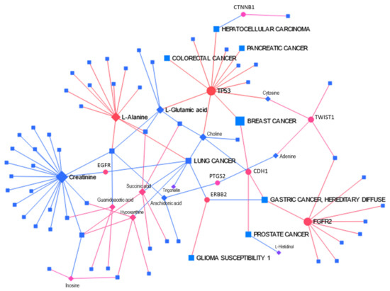To show that the explored genes presented in Table 2 interact closely with the metabolites from the original open source dataset1 and impact mammalian breast cancer, we used MetaboAnalyst’s 5.0 Network Analysis, especially its Metabolite-Gene-Disease Interaction Network application. This network provides a scheme of potential functional relationships between metabolites, connected genes, and target diseases. Six subnetworks were elucidated: one with 86 nodes, 100 edges, and 21 seeds and five with 3 nodes, 2 edges, and 1 seed each. The main subnetwork is presented in Figure 3. The network shows that most selected metabolites and genes are connected and lead to different diseases, including cancers, with breast cancer among them.