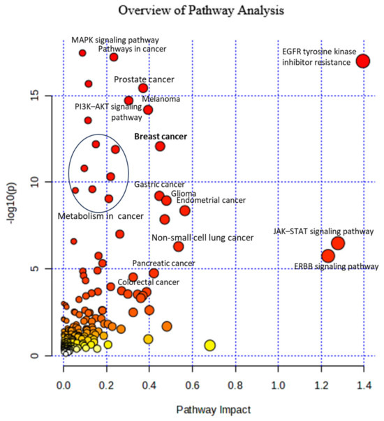 The MAPK signaling pathway, Pathways in cancer, and EGFR tyrosine kinase inhibitor resistance have the best p-values: 7.823 × 10−19, 9.137 × 10−19, and 3.891 × 10−18, correspondingly. The breast cancer pathway has p value = 3.608 × 10−13 and an impact score of 0.45, which reflects that this pathway has an over-average significance.