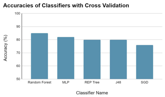 Among the classifiers, J48, REP Tree, MLP, and Random Forest showed accuracy above 80%, with Random Forest achieving the highest accuracy of 90.02% (Figure 6). To evaluate the classifiers, we used cross-validation, which involves dividing the dataset into ten folds and testing each fold on the remaining nine folds for training, repeating the process ten times for each distinct fold. The results of each test were then averaged to obtain the accuracy of each classifier. Cross-validation helps in reducing the variance of the estimate, making the results more reliable.