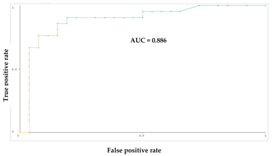 Figure 7 shows the ROC (receiver operating characteristic) curve for the ML classifier. The X-axis of the curve plots the false positive rate, and the Y-axis plots the true positive rate. This curve reflects the performance of the model at various classification thresholds. The comparison of these values through the curve allows for the identification of how likely the model is to maximize true positives and minimize false positives in the data. The area under the curve (AUC) is 0.886, which is close to 1. AUC provides an aggregate measure of performance across all possible classification thresholds; the higher the AUC, the better the performance. There is another characteristic to evaluate performance of ML model—the precision-recall curve, which is the measure between precision and recalls for different thresholds. As the curve approaches the top right of the graph, it demonstrates that the model has good prediction accuracy. (Table 4).