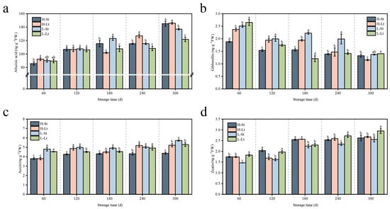 - Zhao, Y.; Han, G.; Li, Y.; Lv, H. Changes in quality characteristics and metabolites composition of wheat under different storage temperatures. J. Stored Prod. Res. 2024, 105, 102229. [Google Scholar] [CrossRef]