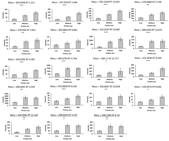 Metabolites with significant dose–response relationships (* p < 0.05, ** p < 0.01, and *** p < 0.001). The feature with a mass = 368.11 is significant between the low and medium portions. The metabolites in the bottom row were acquired in the positive mode. Values are the means ± SEM. X-axis values represent different portions of berry intake; low, medium, and high portions of mixed strawberries and blueberries were 78 g, 278 g, and 428 g (equal parts strawberries and blueberries). Y-axis values represent the peak height normalized by osmolality. Significance was assessed using repeated measures ANOVA.