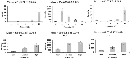 The supplementary biomarkers from previous research with time– and dose–response relationships in the positive mode. Values are the means ± SEM. The top panel represents the time-course plots with the X-axis indicating the timepoints after intake of 192 g of strawberries with 150 g of blueberries; Y-axis values represent the peak height. The bottom panel represent the dose–response data with the X-axis values representing different portions of mixed strawberries and blueberries intake, specifically 78 g (low), 278 g (medium), and 428 g (high), consisting of equal parts strawberries and blueberries. Y-axis values represent the peak height normalized by osmolality. Repeated measures ANOVA was conducted to assess significant changes in the intensities of the biomarkers after consuming the 3 different portions of mixed strawberries and blueberries ** p < 0.01, and *** p < 0.001).